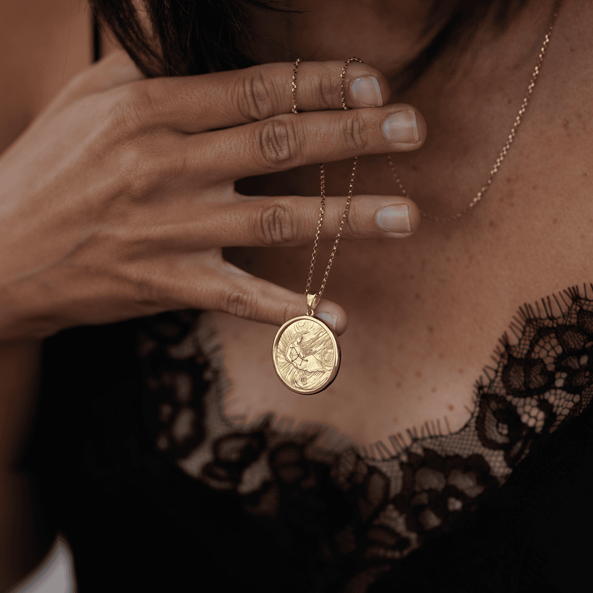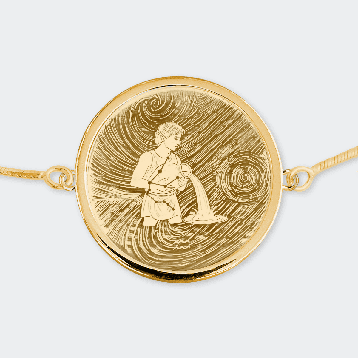 A beautifully hand-drawn depiction of the Aquarius Zodiac, finely etched onto a 18k Gold Vermeil pendant, framed in a stunning 18k Gold Vermeil bezel and set with an elegant 18k Gold Vermeil adjustable snake chain bracelet. Each piece is laser engraved and carefully polished by hand.