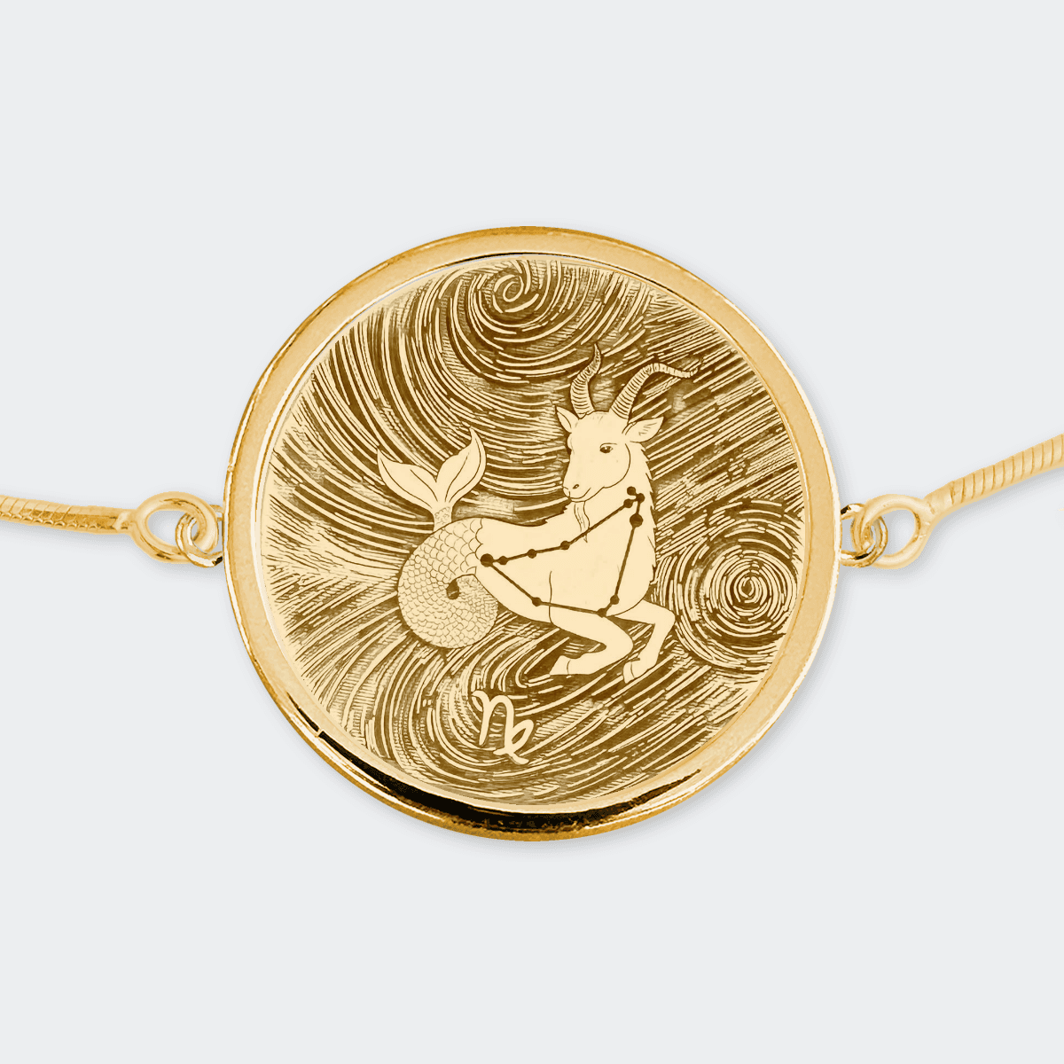 A beautifully hand-drawn depiction of the Capricorn Zodiac, finely etched onto a 18k Gold Vermeil pendant, framed in a stunning 18k Gold Vermeil bezel and set with an elegant 18k Gold Vermeil adjustable snake chain bracelet. Each piece is laser engraved and carefully polished by hand.