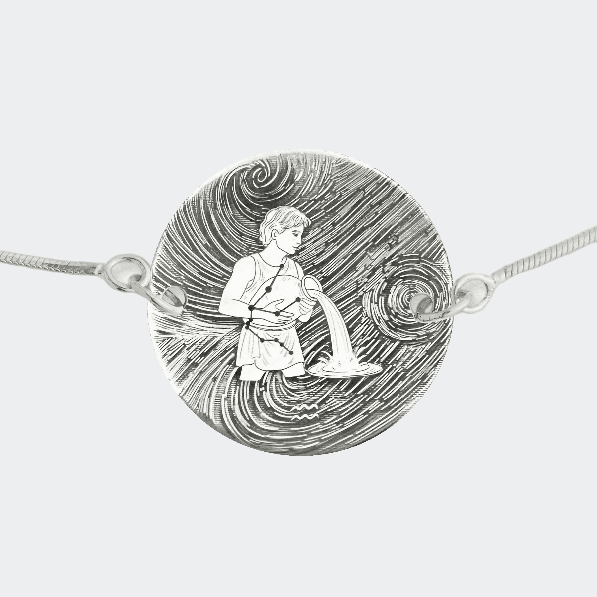 A beautifully hand-drawn depiction of the Aquarius Zodiac, finely etched onto a Sterling Silver pendant and set with an elegant Sterling Silver adjustable snake chain bracelet. Each piece is laser engraved and carefully polished by hand.