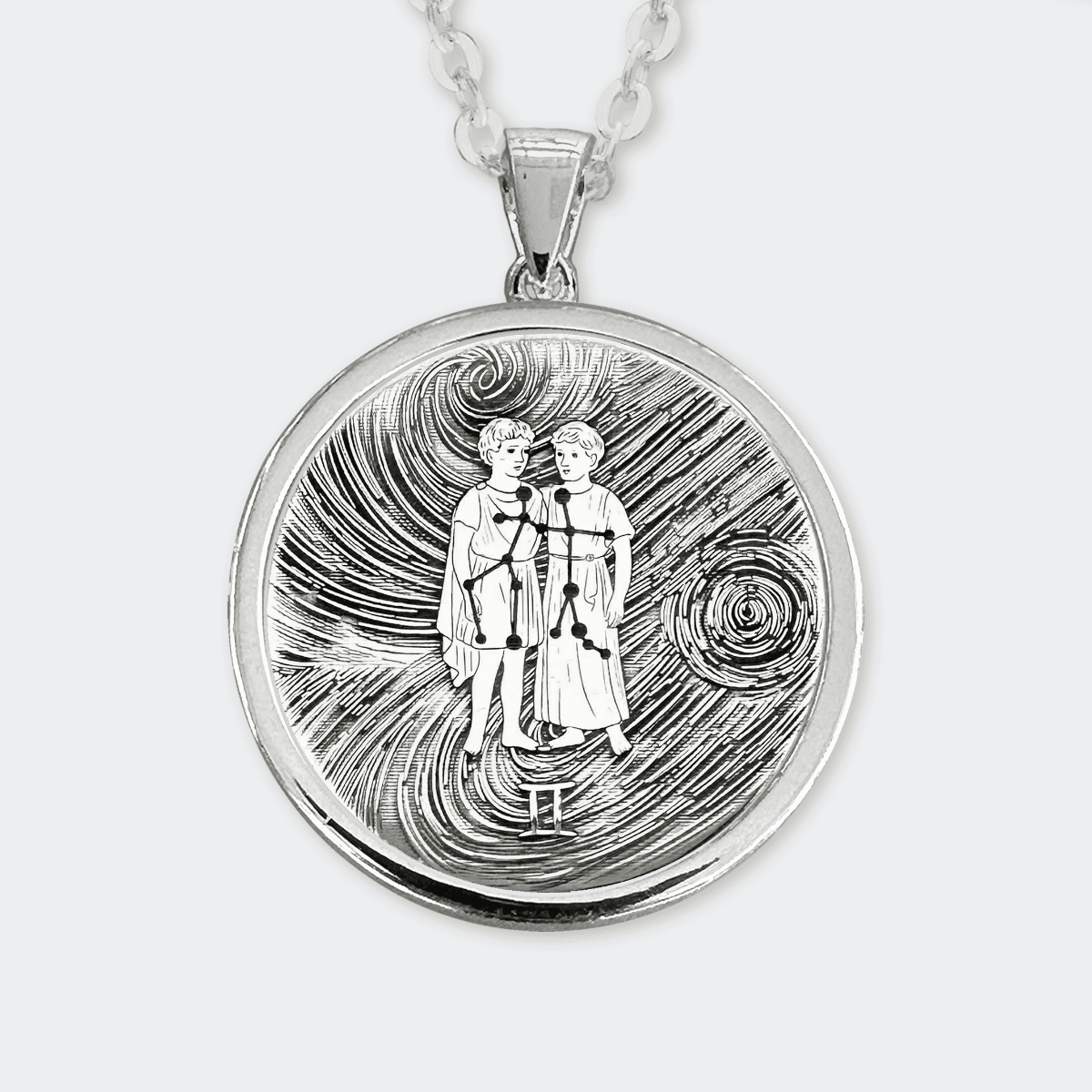 A beautifully hand-drawn depiction of the Gemini Zodiac, finely etched onto a Sterling Silver pendant, framed in a stunning sterling silver bezel and suspended from an elegant 18-inch Silver chain. Each piece is laser engraved and carefully polished by hand