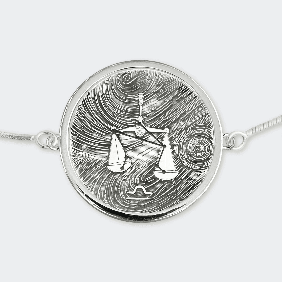 A beautifully hand-drawn depiction of the Libra Zodiac, finely etched onto a Sterling Silver pendant, framed in a stunning sterling silver bezel and set with an elegant Sterling Silver adjustable snake chain bracelet. Each piece is laser engraved and carefully polished by hand.