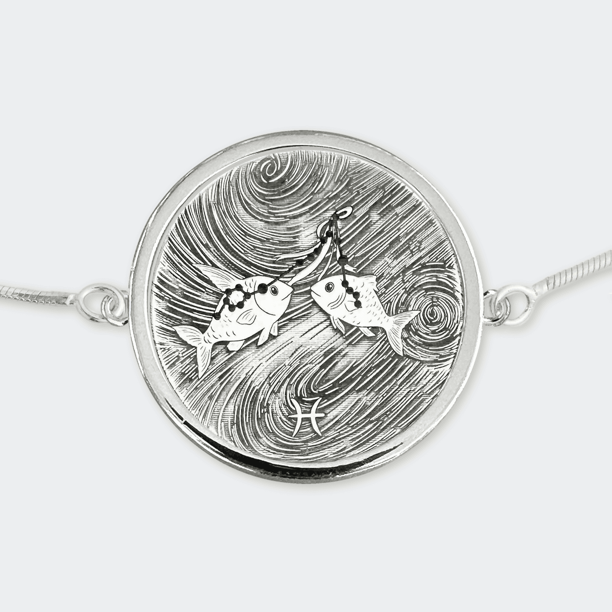 A beautifully hand-drawn depiction of the Pisces Zodiac, finely etched onto a Sterling Silver pendant, framed in a stunning sterling silver bezel and set with an elegant Sterling Silver adjustable snake chain bracelet. Each piece is laser engraved and carefully polished by hand.