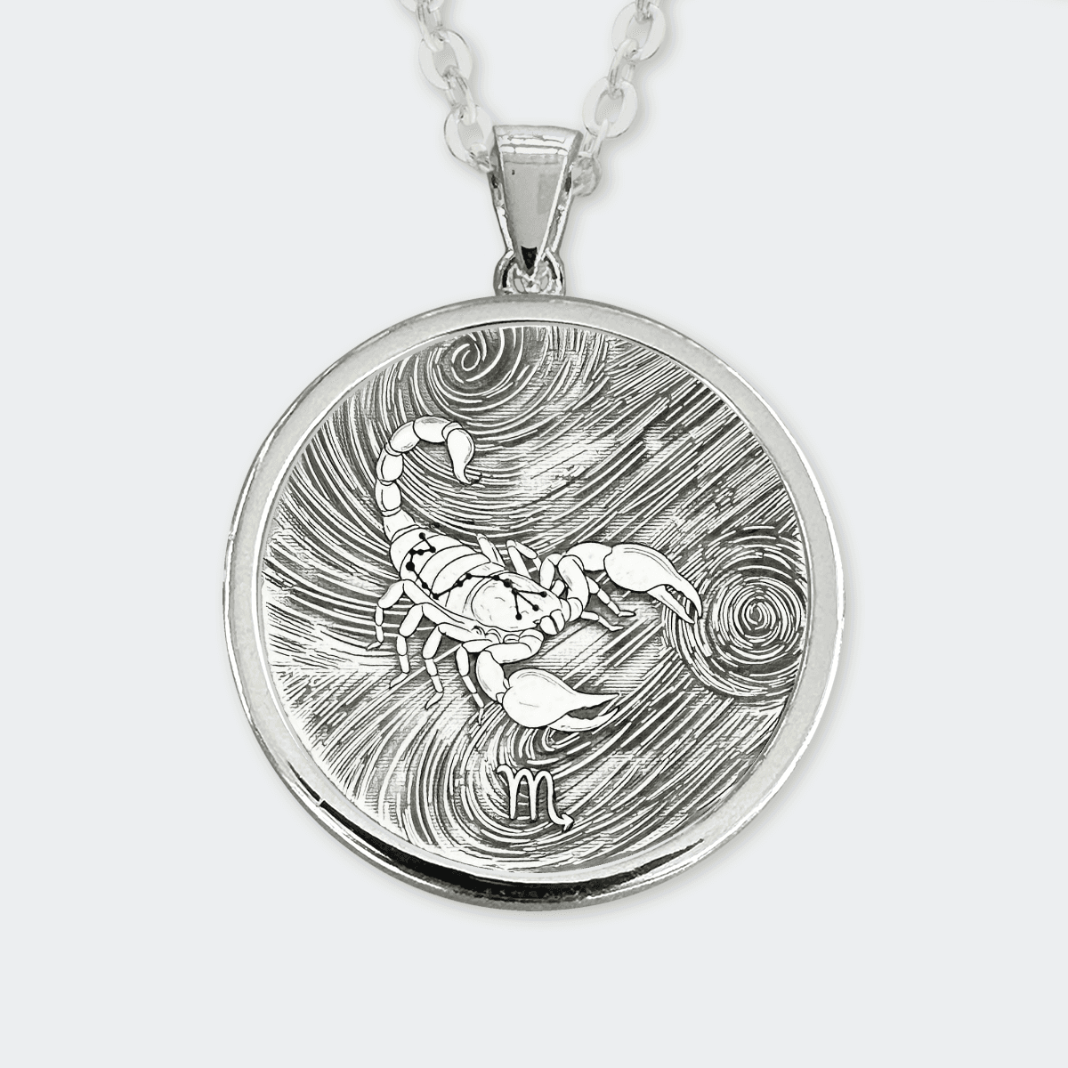 A beautifully hand-drawn depiction of the Scorpio Zodiac, finely etched onto a Sterling Silver pendant, framed in a stunning sterling silver bezel and suspended from an elegant 18-inch Silver chain. Each piece is laser engraved and carefully polished by hand.