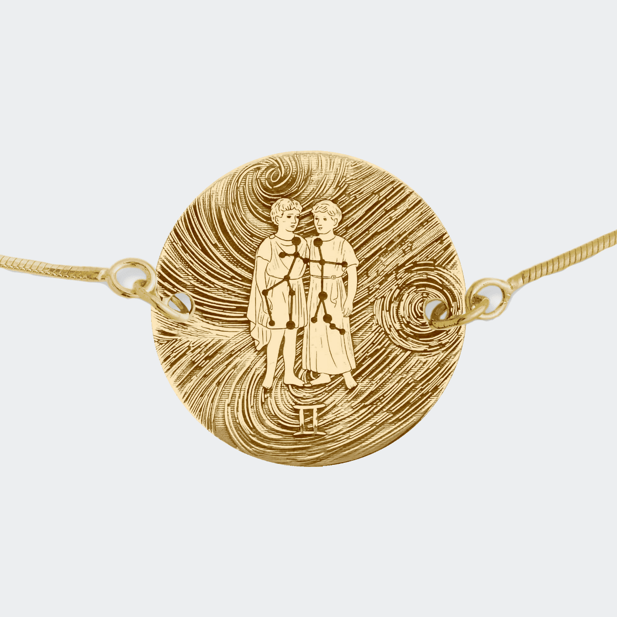 A beautifully hand-drawn depiction of the Gemini Zodiac, finely etched onto a 18k Gold Vermeil pendant and set with an elegant 18k Gold Vermeil adjustable snake chain bracelet. Each piece is laser engraved and carefully polished by hand