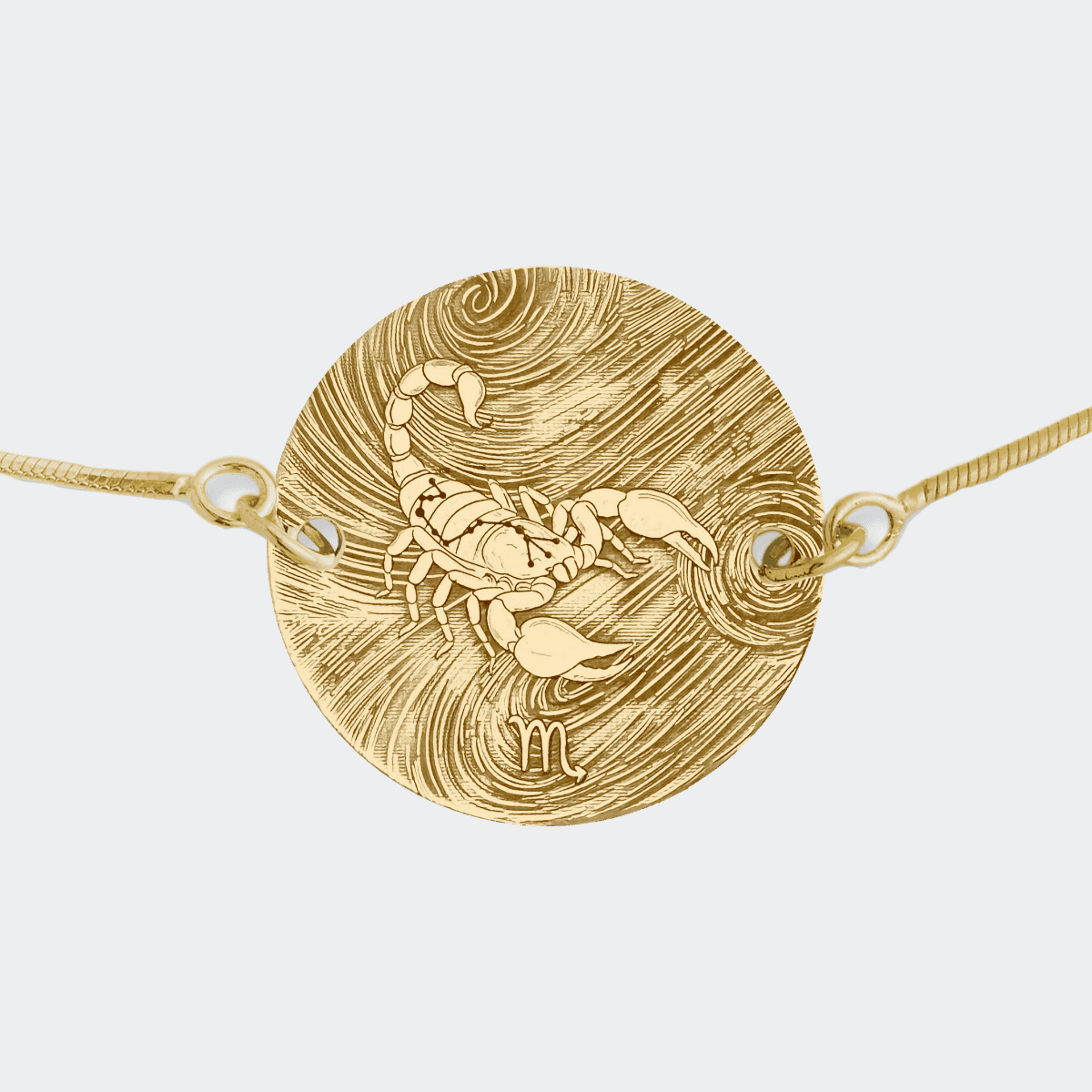A beautifully hand-drawn depiction of the Scorpio Zodiac, finely etched onto a 18k Gold Vermeil pendant and set with an elegant 18k Gold Vermeil adjustable snake chain bracelet. Each piece is laser engraved and carefully polished by hand.