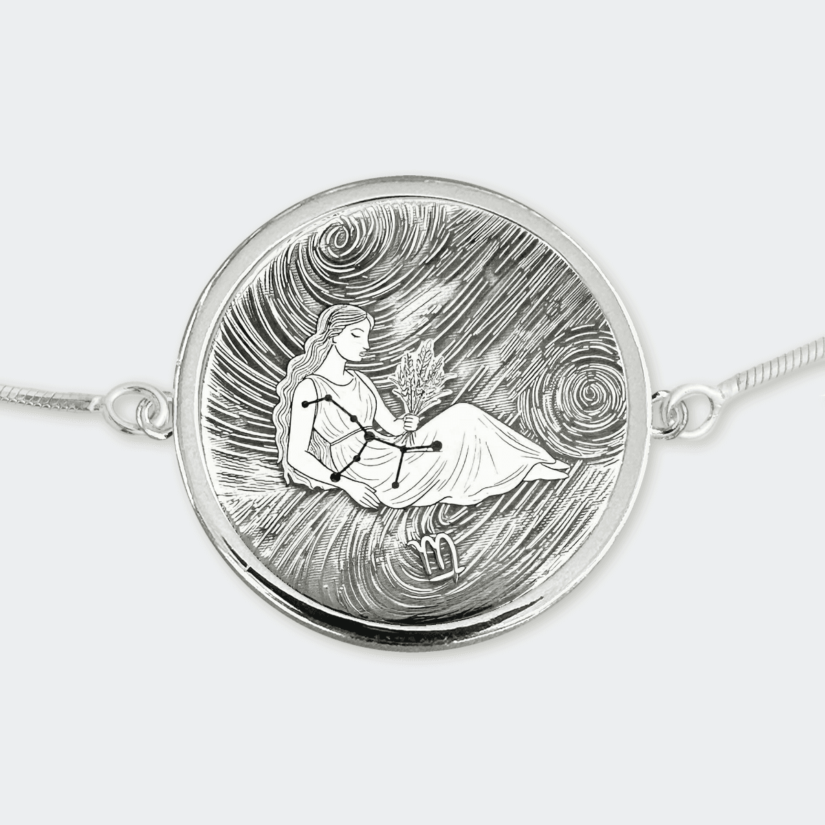 A beautifully hand-drawn depiction of the Virgo Zodiac, finely etched onto a Sterling Silver pendant, framed in a stunning sterling silver bezel and set with an elegant Sterling Silver adjustable snake chain bracelet. Each piece is laser engraved and carefully polished by hand.