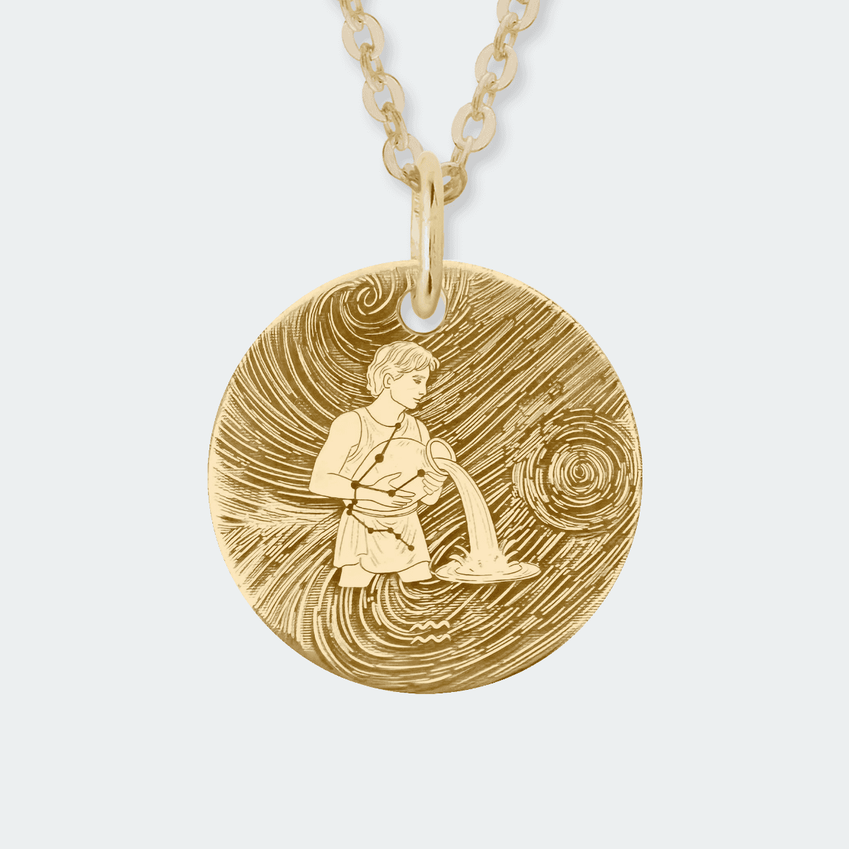 A beautifully hand-drawn depiction of the Aquarius Zodiac, finely etched onto a 18k Gold Vermeil pendant, framed in a stunning 18k Gold Vermeil bezel and suspended from an elegant 18-inch gold vermeil chain. Each piece is laser engraved and carefully polished by hand.