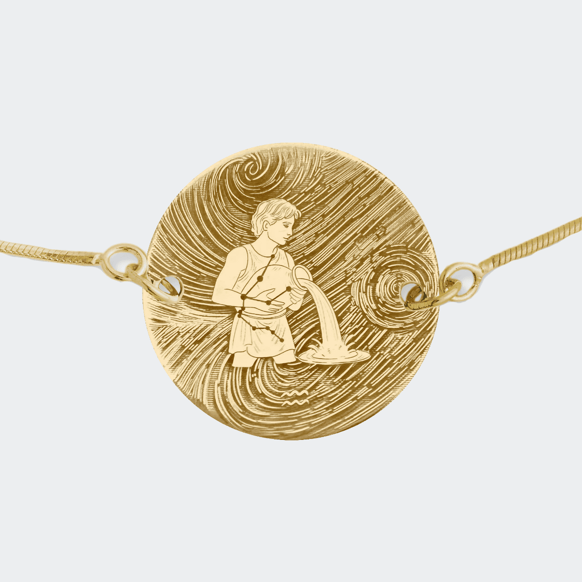 A beautifully hand-drawn depiction of the Aquarius Zodiac, finely etched onto a 18k Gold Vermeil pendant and set with an elegant 18k Gold Vermeil adjustable snake chain bracelet. Each piece is laser engraved and carefully polished by hand.