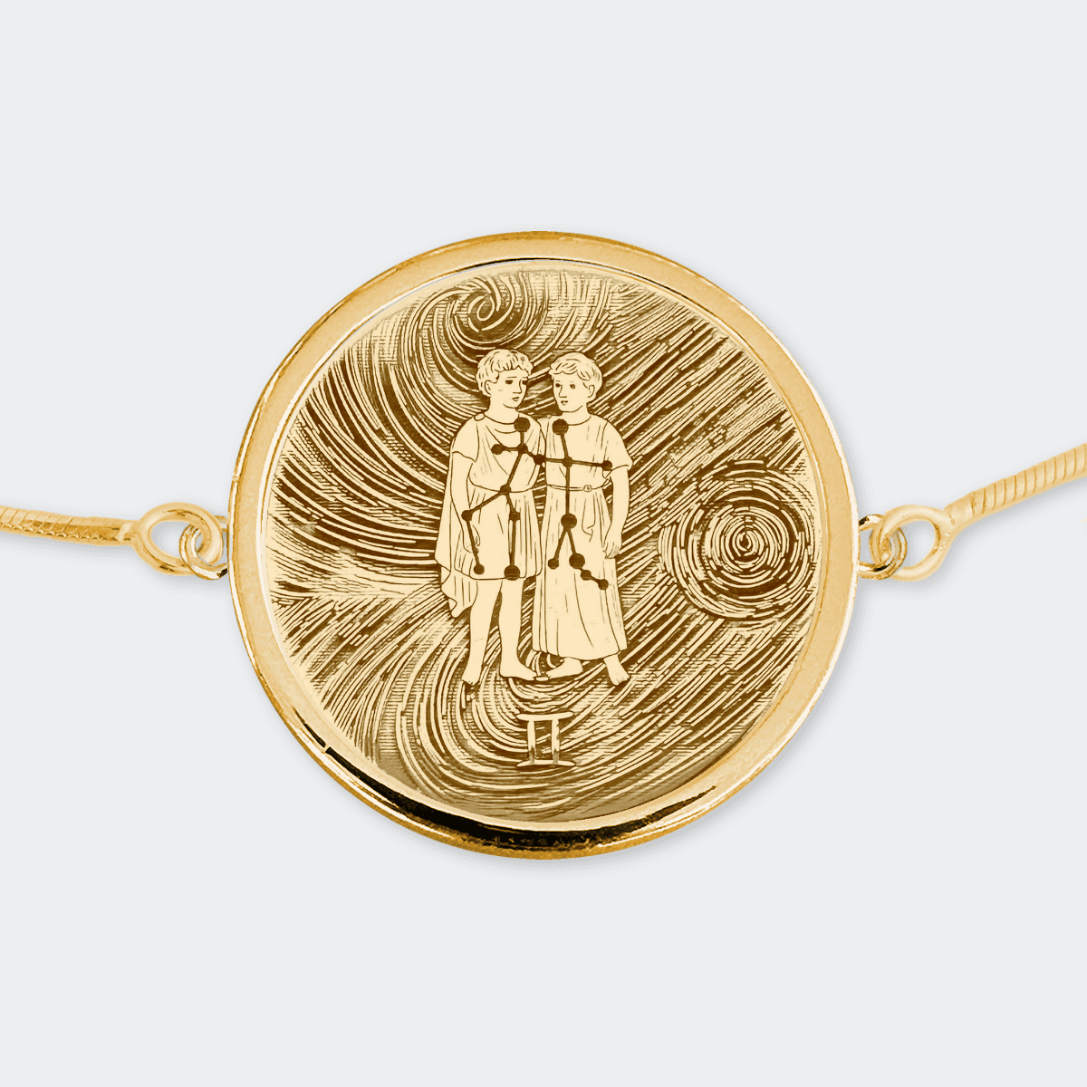 A beautifully hand-drawn depiction of the Gemini Zodiac, finely etched onto a 18k Gold Vermeil pendant, framed in a stunning 18k Gold Vermeil bezel and set with an elegant 18k Gold Vermeil adjustable snake chain bracelet. Each piece is laser engraved and carefully polished by hand