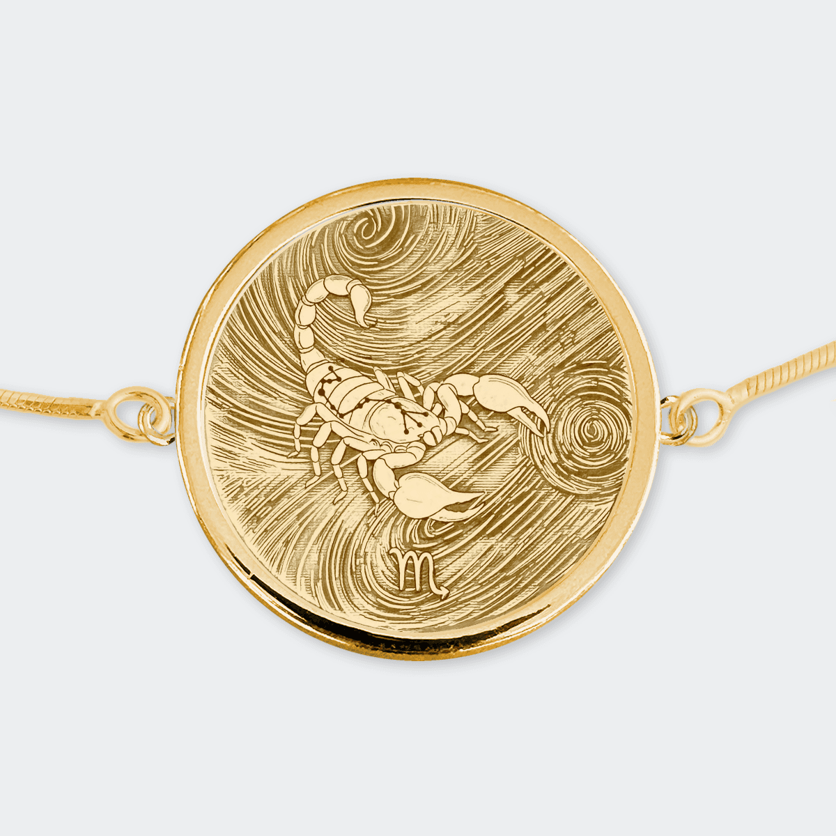 A beautifully hand-drawn depiction of the Scorpio Zodiac, finely etched onto a 18k Gold Vermeil pendant, framed in a stunning 18k Gold Vermeil bezel and set with an elegant 18k Gold Vermeil adjustable snake chain bracelet. Each piece is laser engraved and carefully polished by hand.