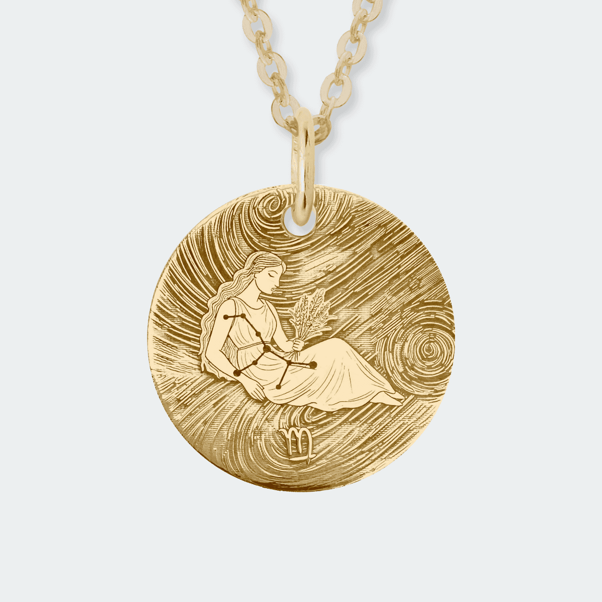 A beautifully hand-drawn depiction of the Virgo Zodiac, finely etched onto a 18k Gold Vermeil pendant and suspended from an elegant 18-inch Gold Vermeil chain. Each piece is laser engraved and carefully polished by hand.