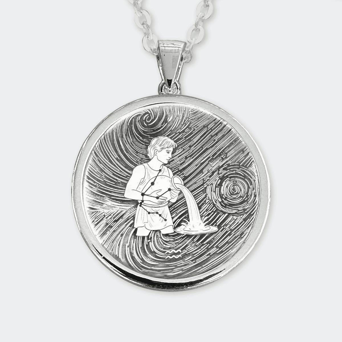 A beautifully hand-drawn depiction of the Aquarius Zodiac, finely etched onto a Sterling Silver pendant, framed in a stunning sterling silver bezel and suspended from an elegant 18-inch Silver chain. Each piece is laser engraved and carefully polished by hand.