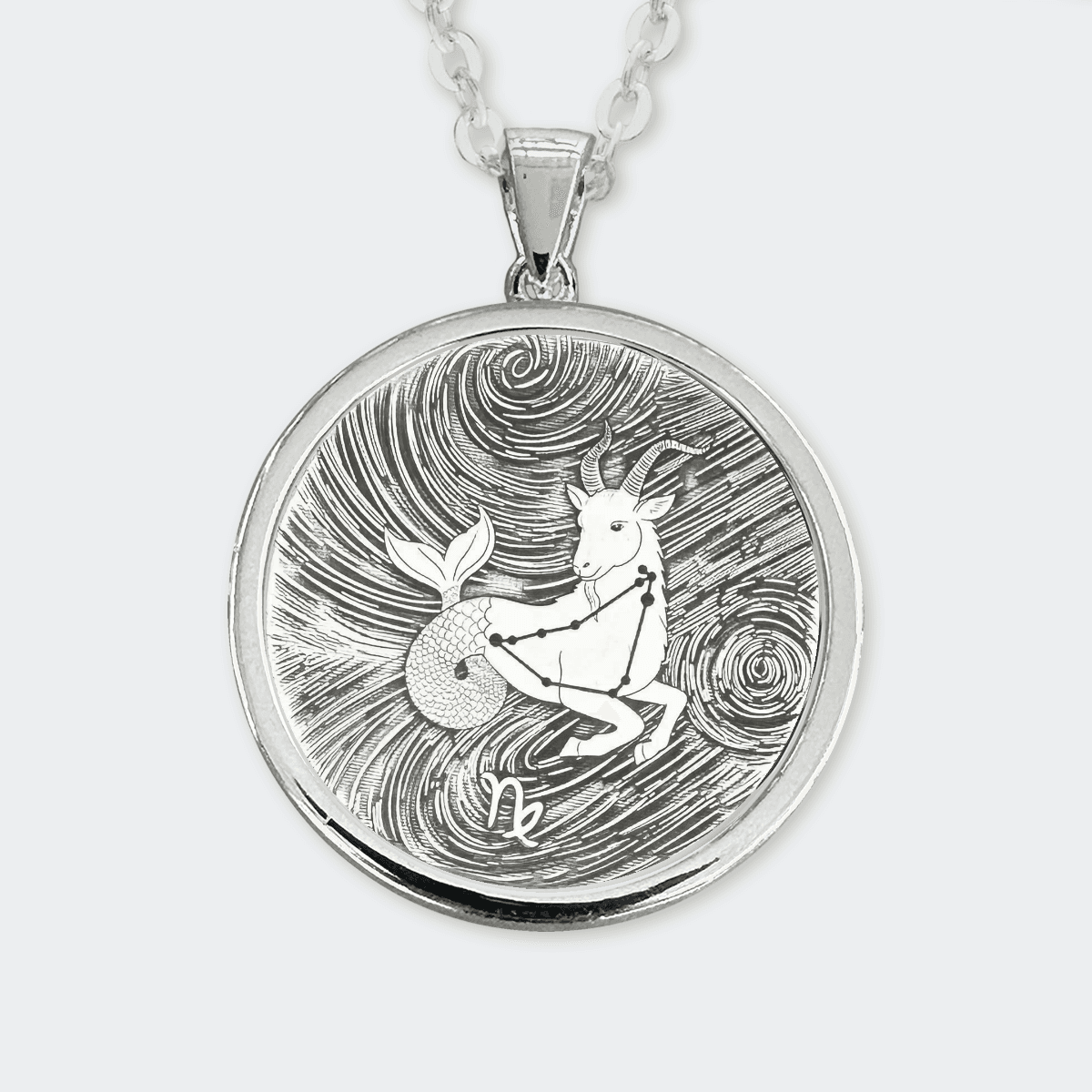 A beautifully hand-drawn depiction of the Capricorn Zodiac, finely etched onto a Sterling Silver pendant, framed in a stunning sterling silver bezel and suspended from an elegant 18-inch Silver chain. Each piece is laser engraved and carefully polished by hand.