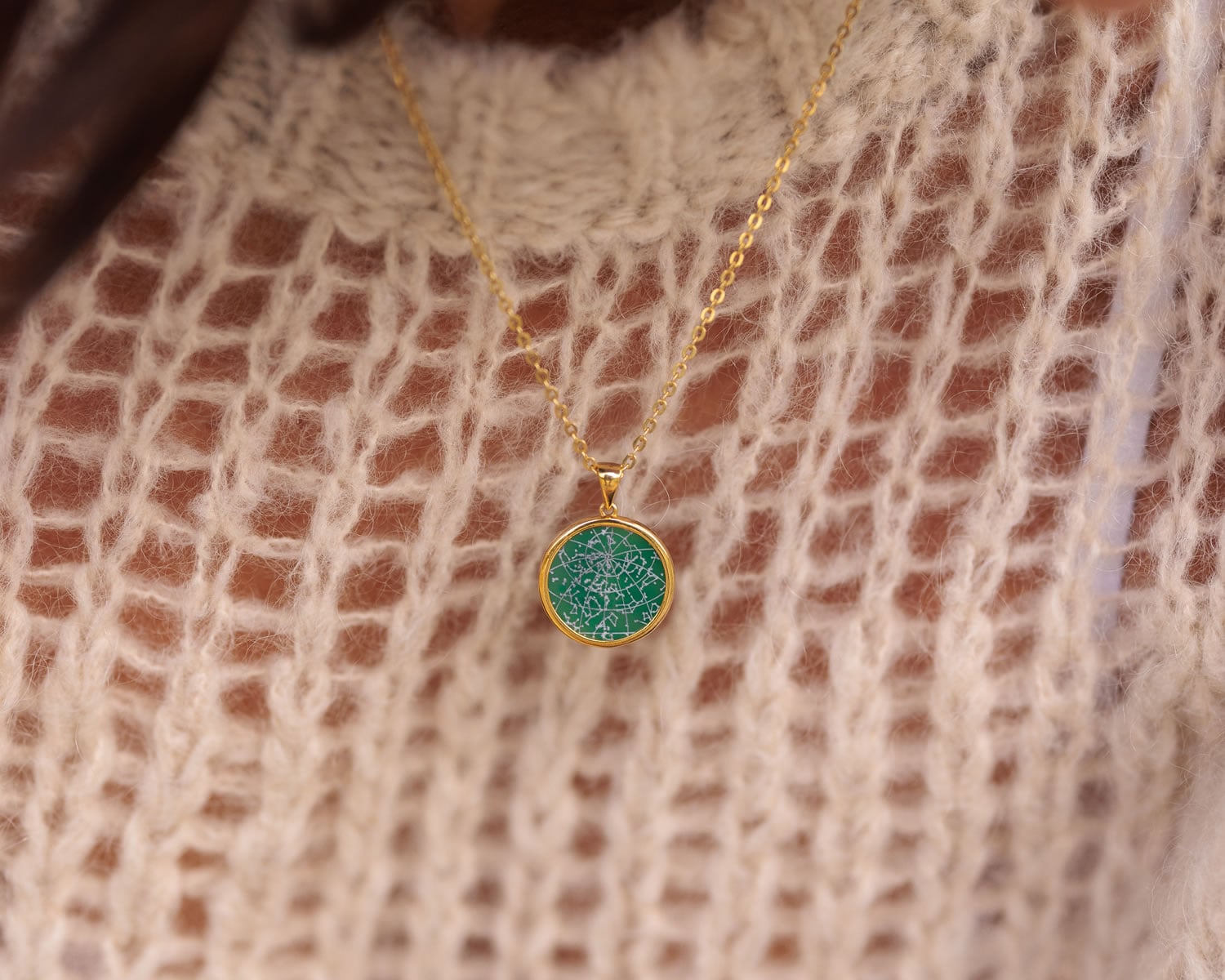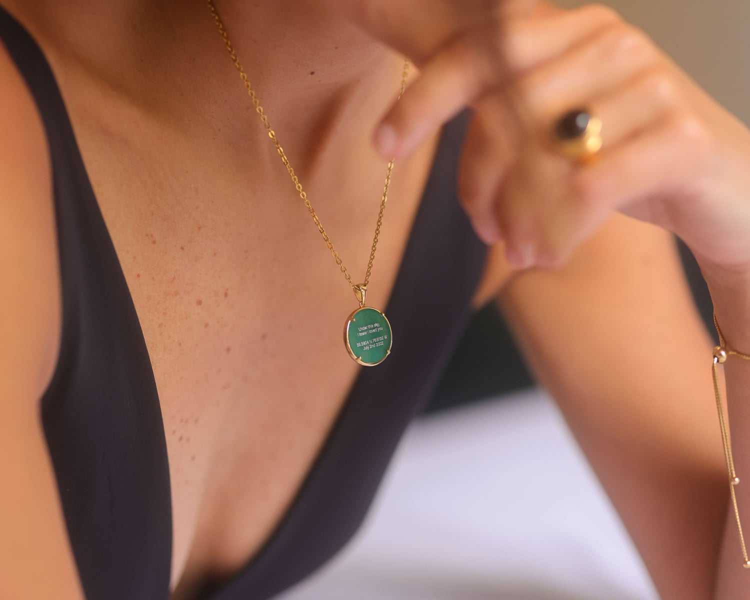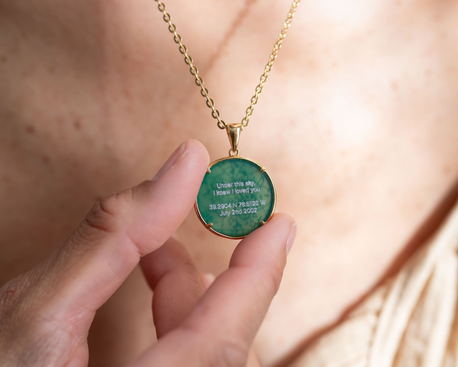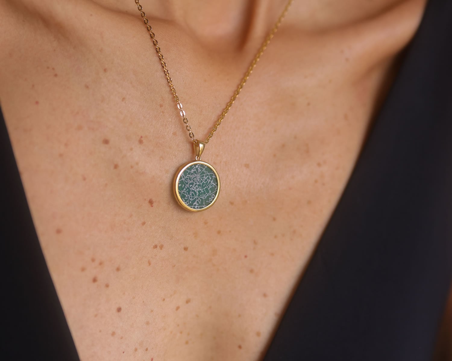 Frame your memories with our latest Bezel-Mount Onyx Collection — featuring a green onyx gemstone set in luxurious 18k gold vermeil or sterling silver. Your Night Sky is meticulously etched onto onyx and framed by a sterling silver or 18k gold bezel, creating a striking, high-contrast and visually stunning piece. Timeless jewelry to treasure always.