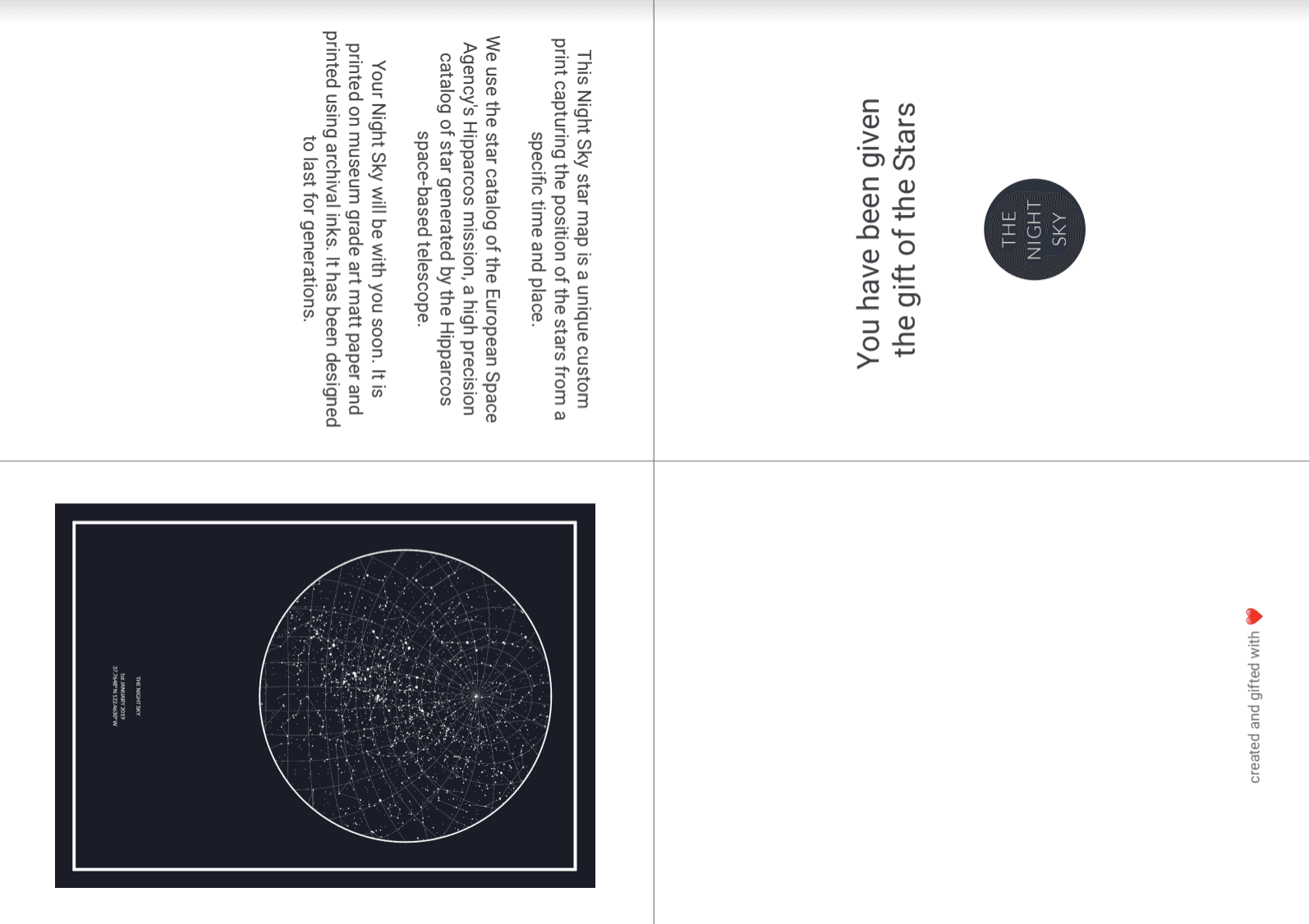 Here is an example of the printable digital card; it can be printed on stardard size office paper. Once printed you can folder it in four to create your card. The recipient will see all the detail of the Night Sky you created especially for them. 💌