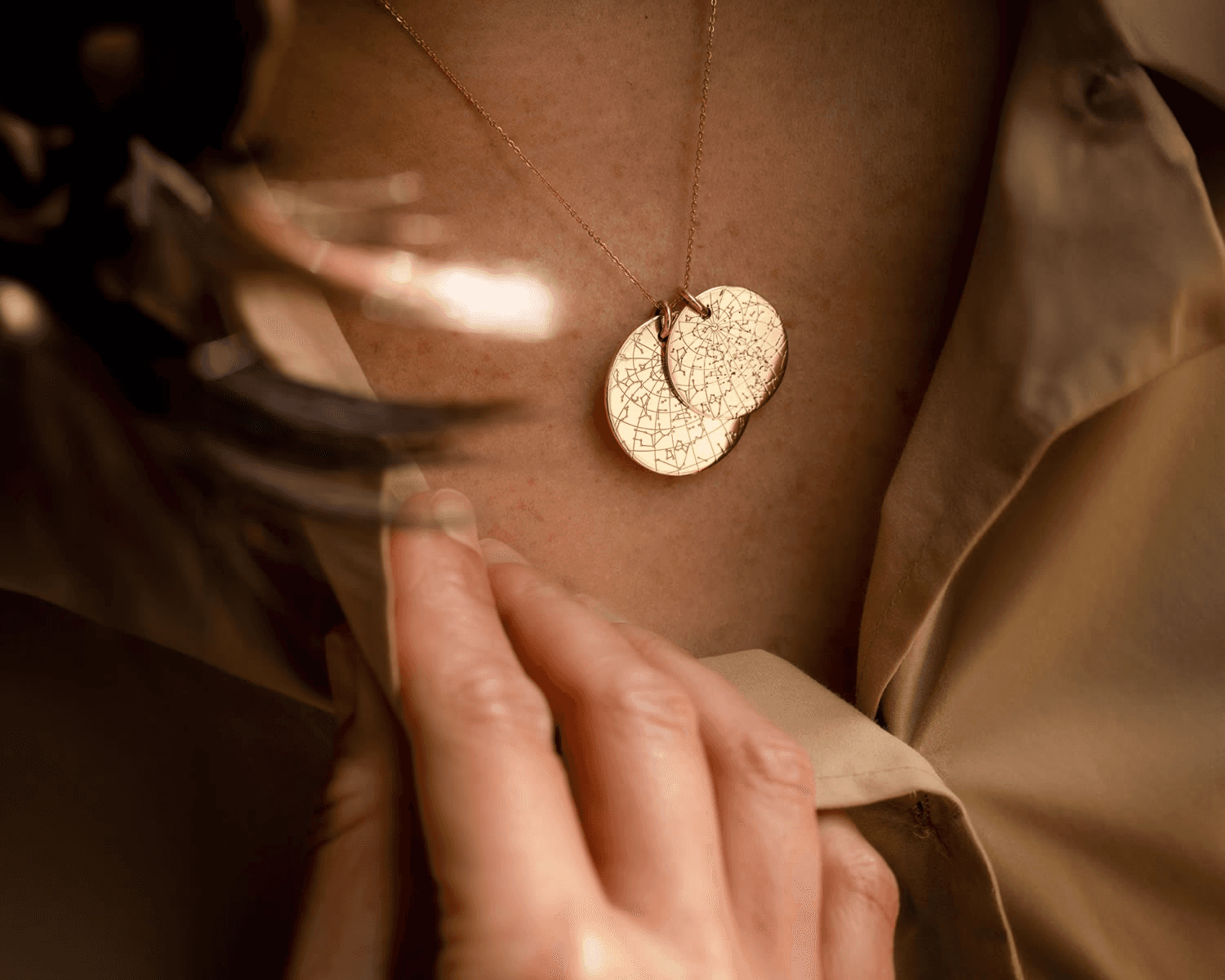 Engraved in textured relief, every piece has a rich, tactile finish that feels timeless. Encased in precious metal and engraved with your bespoke details, the Eclipse Collection is made to be worn close to your heart — a harmony of light, shadow, earth, and sky.