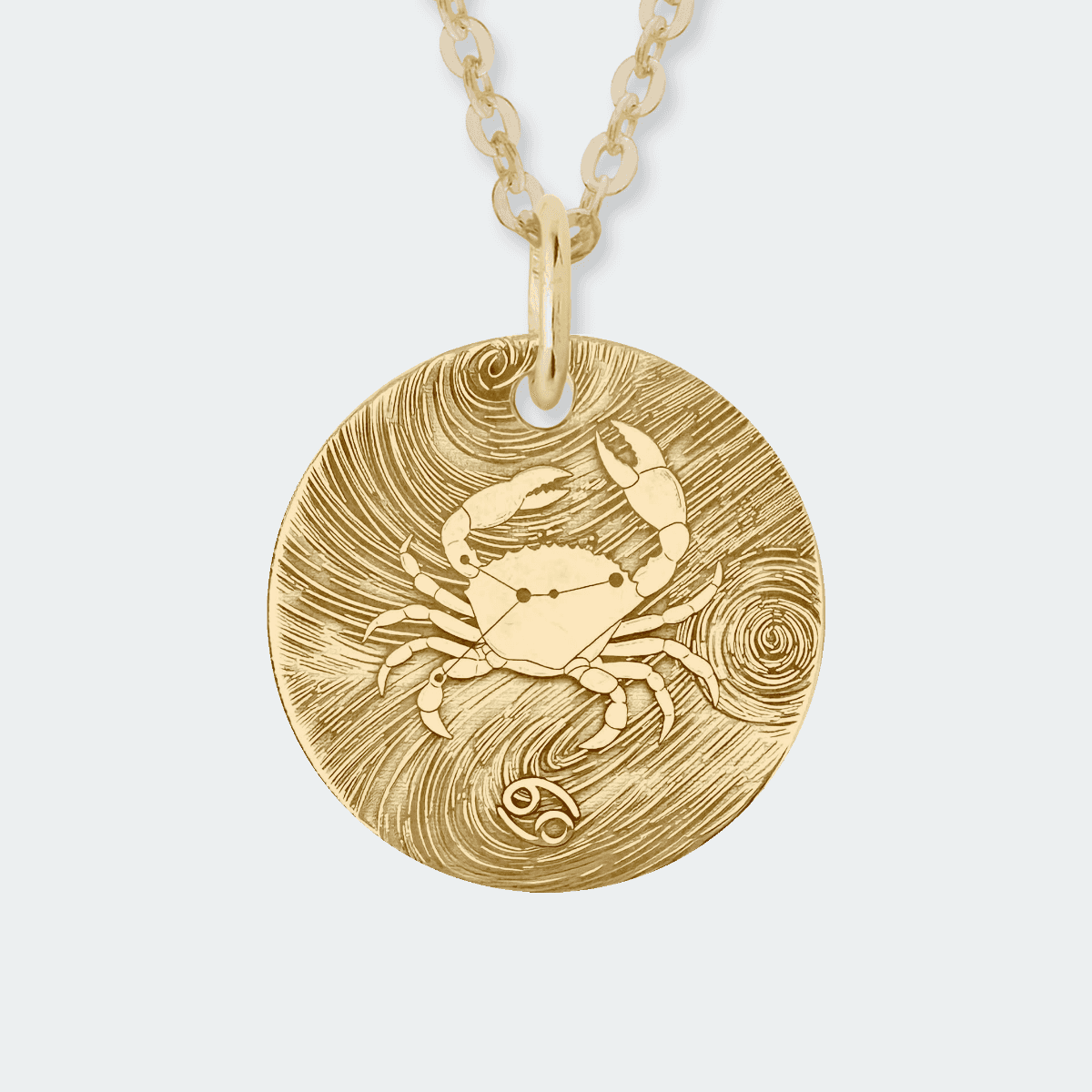 A beautifully hand-drawn depiction of the Cancer Zodiac, finely etched onto a 18k Gold Vermeil pendant and suspended from an elegant 18-inch Gold Vermeil chain. Each piece is laser engraved and carefully polished by hand.
